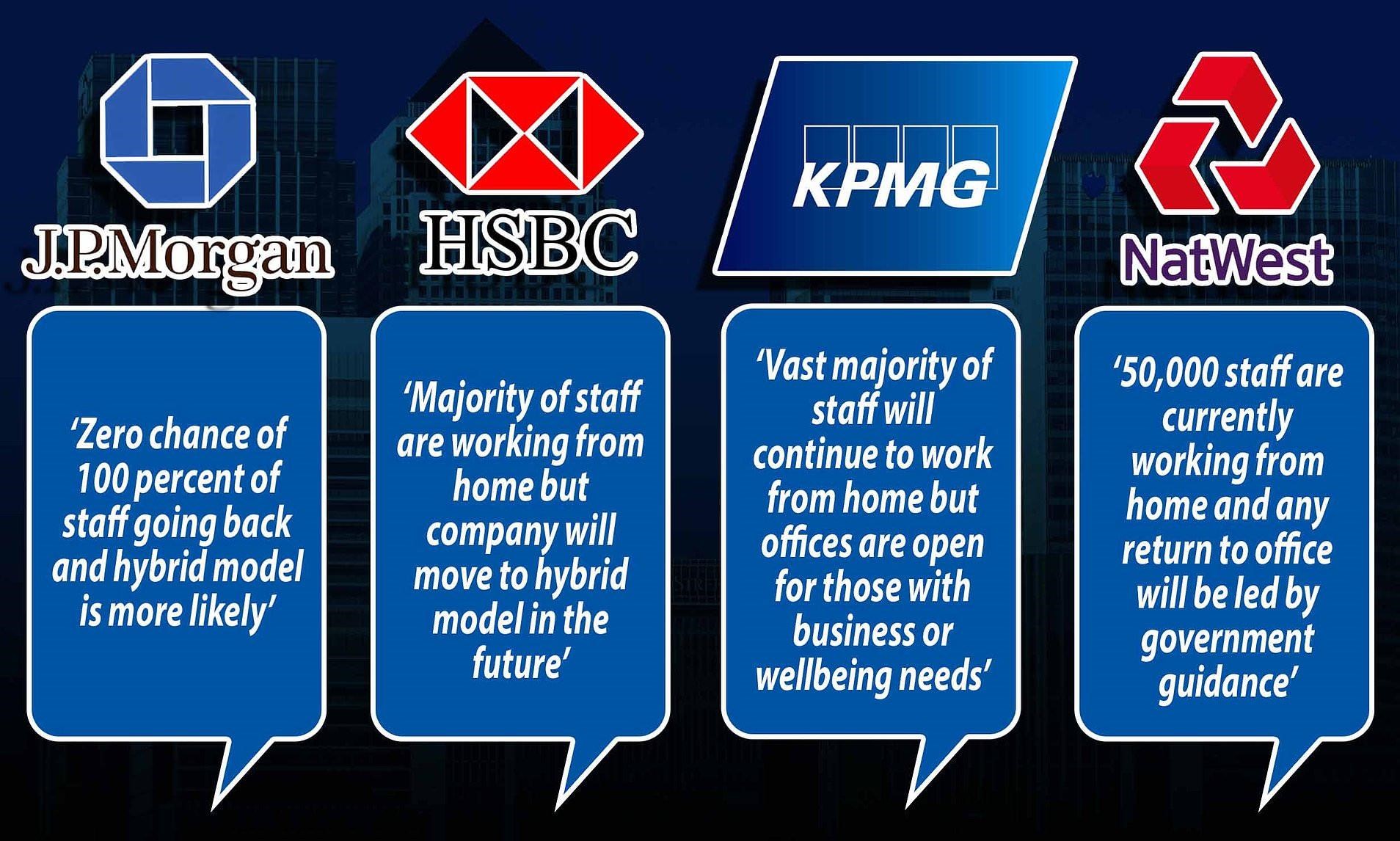 Feehan, K., 2021. Will WFH go on forever? Firms say they’ll look at ‘hybrid models’ instead of sending all workers back to the office after Canary Wharf chief revealed ‘gradual’ return to desks will start from March 29. [Online]. Available from: https://www.dailymail.co.uk/news/article-9311487/The-beginning-END-Canary-Wharf-chief-says-gradual-return-desks-start-March-29.html [Accessed on 28th February 2022]